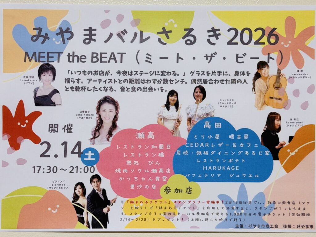 みやまバルさるき2026は、音楽とみやまの人気飲食店がコラボレーションする、まさに「音と食の出会い」を楽しむ企画です。美しい音楽を聴きながら美味しい料理を堪能することで、その楽しさは大きく広がります。バレンタインデーの2月14日、いつも通っているお店で特別なステージを楽しんでみませんか♪