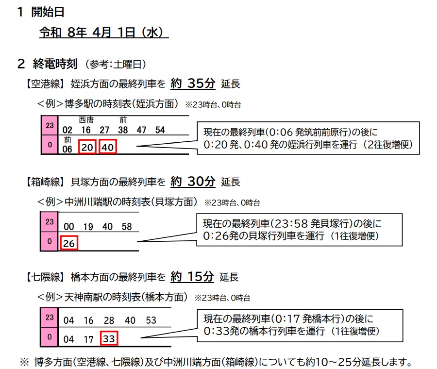 ※上記の画像は、参考例になります。詳細な時刻は、後日「福岡市交通局」公式サイト(トップページの「お知らせ」にて記載)や「福岡市地下鉄」の各駅に掲示される予定です。