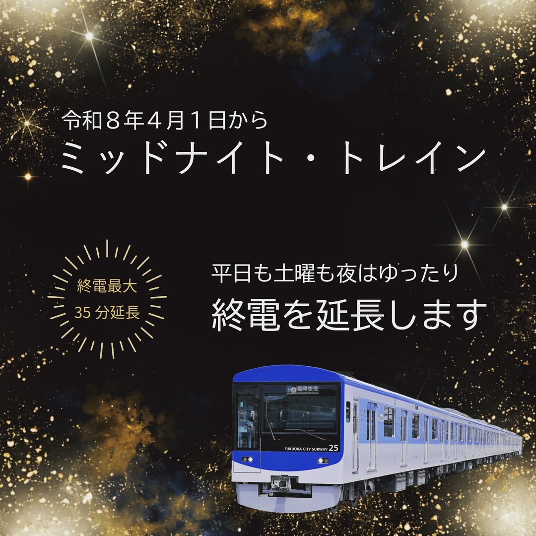 2026年4月1日(水)より、「福岡市地下鉄」全線で月曜日から土曜日までに終電時刻を延長する「ミッドナイト・トレイン」が運行予定です。